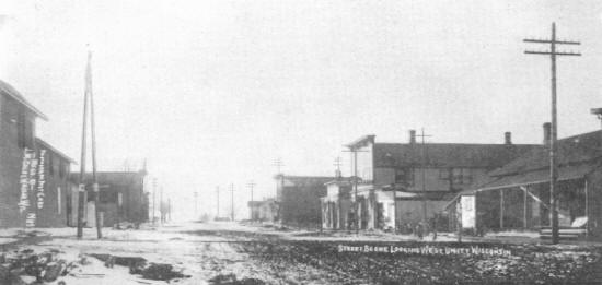 "The business population is almost equally divided on both sides of the village. On the east, or in Marathon County, are the following: the Unity Mfg. Co. runs a sawmill and cheese box factory. General Merchandise stores are operated by Groelle and Hamann Christensen, and L. H. Weyers. Perschke and Cutts keep the Hardware; August Weide, the Meat Market. C. Voght and Son sell machinery and Linskog and Jarvis are the blacksmiths. Harness and Leather Works are owned by Phil. Klein. Chris Nelson is the operator of the Nelson Hotel and another is operated by William Glaman. There is also a creamery and cheese factory operated by Otto Rhodes. Dr. J. H. Clark is the physician and surgeon; also has a drugstore. E. L. Messer is the Postmaster; also owns and edits the Marathon County Register. The Unity State Bank is also on this side of the village with the following officers; president, C. E. Blodgett; vice-president, O. Hamann; cashier S. J. Falck, who with J. H. Clark and L. H. Weyers constitute the board of directors."