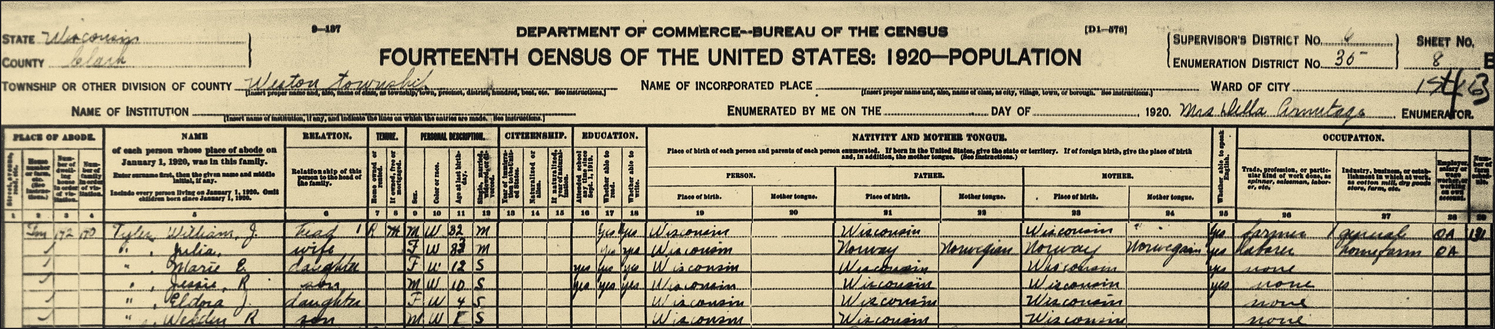 Eldora J Tyler Female 4 Single White Daughter 1916 Wisconsin Wisconsin Wisconsin