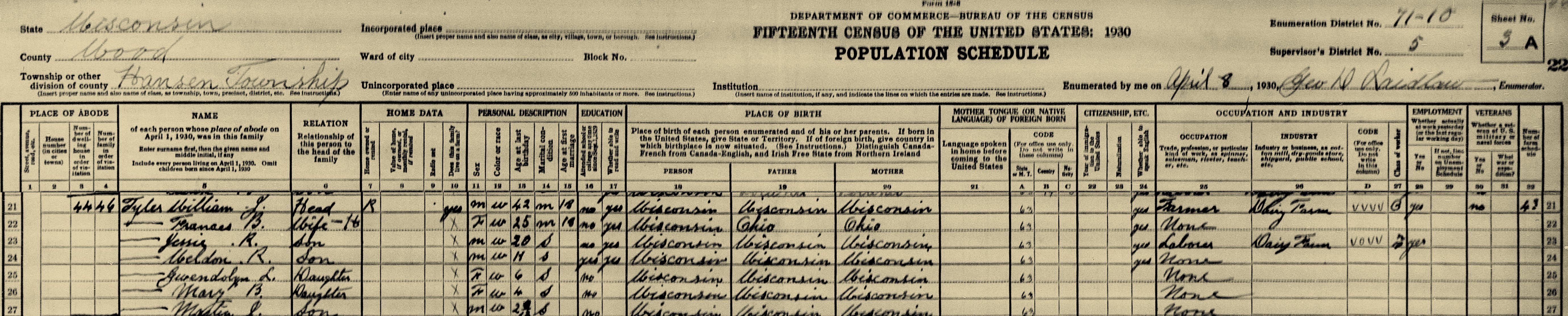 Dale Tyler Male 9 Single White Son Wisconsin 1931