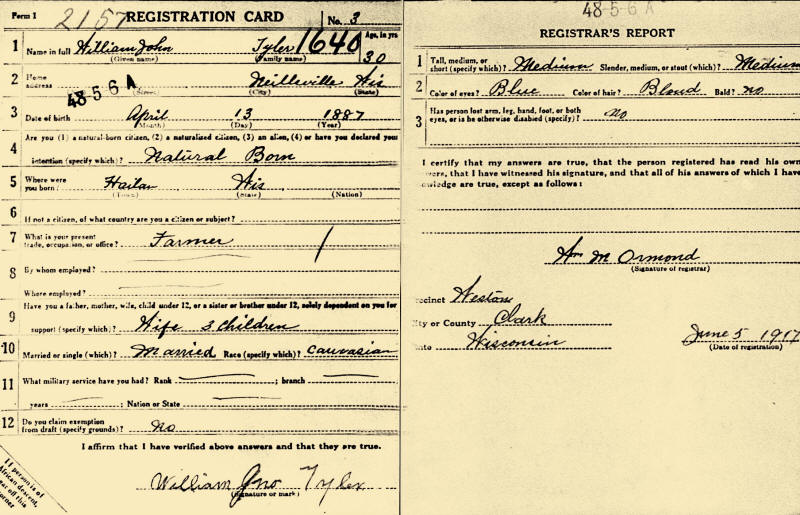 William Tyler Male 53 Married White Head Wisconsin 1887 Rural, Wood, Wisconsin WWI Draft
