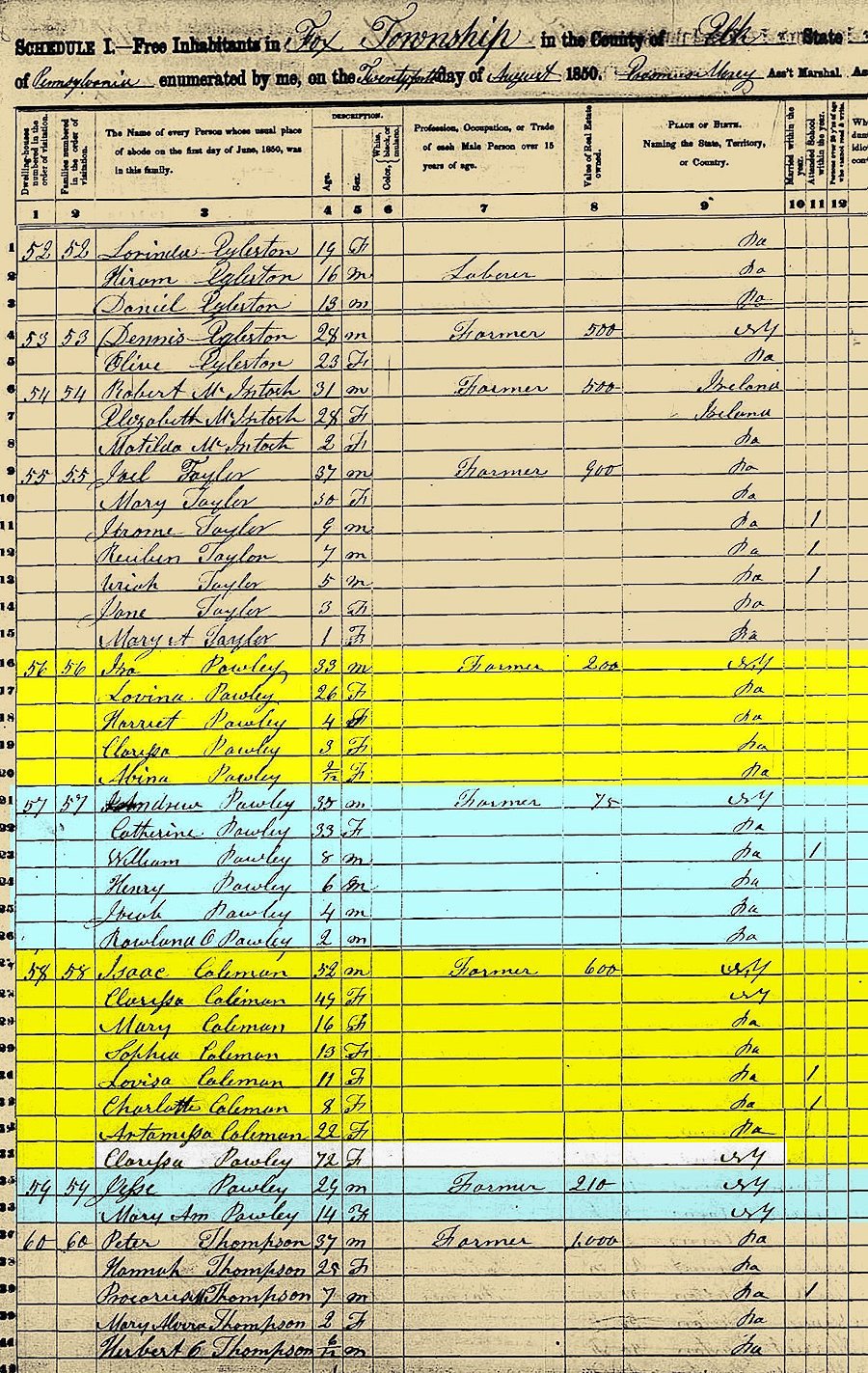 United States Census, 1850 Fox, Elk Co., Pennsylvania