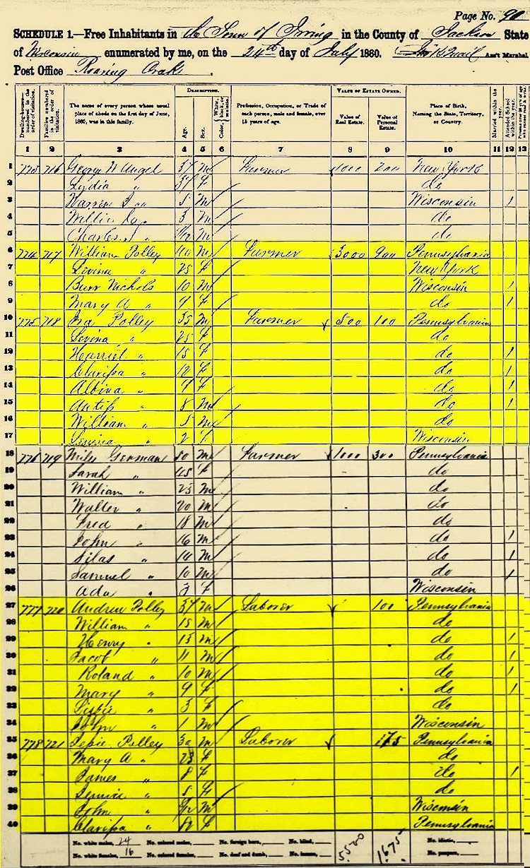1860 Census, Irving, Jackson Co., WI Census with the family of William & Lovina Polley