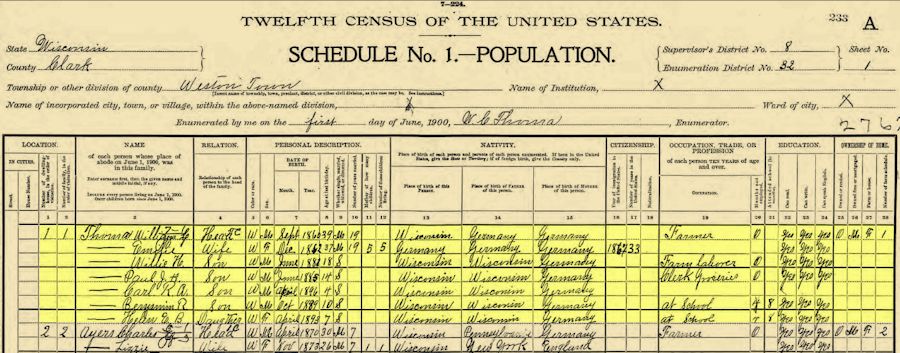 1900 Federal Census, Weston, Clark, Wisconsin, June 1, Sheet #1, Dwelling in Order of Visitation: #1, Family #1