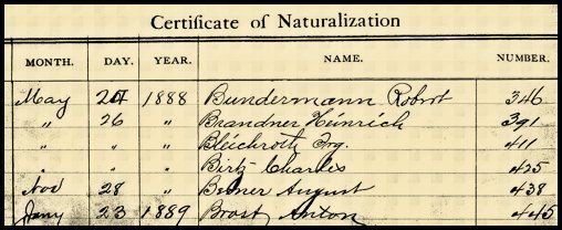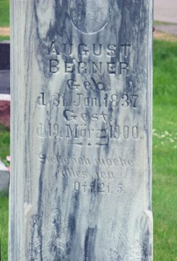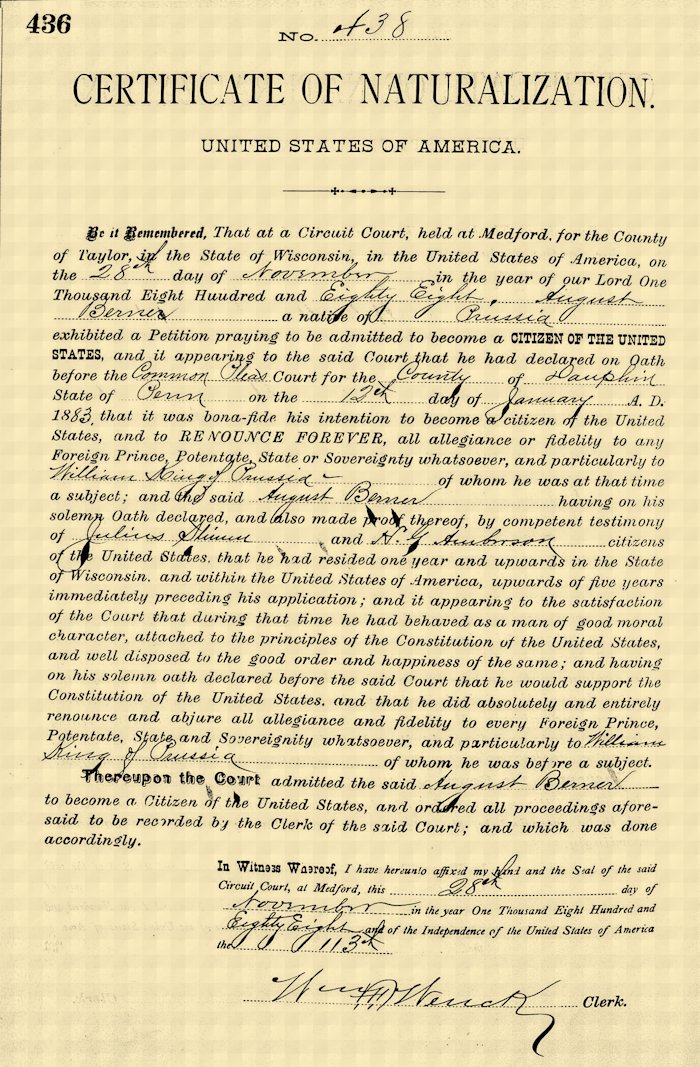 August Berner declared an Oath before the Common Pleas Court in the county of Dauplin, PA on 12 Jan 1883 that it was his bona-fide intention to become a citizen of the United States, and to REMOUNCE FOREVER allegiance to William, King of Prussia. His citizenship was granted 28 Nov 1888, William F. Wenck, Clerk for Taylor Co., Wis.
