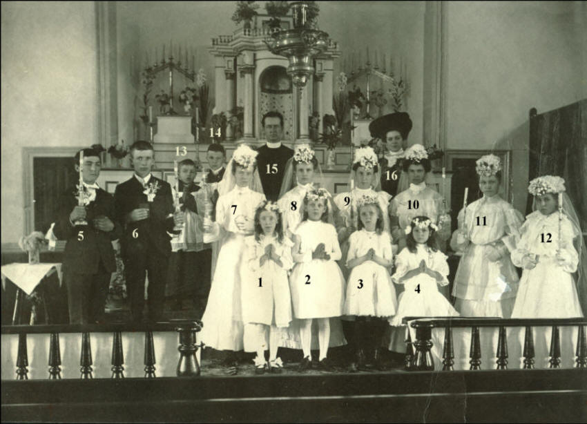 The above photo was found in an old album in the Greenwood Public Library (1881 and Onward) and labeled "Father Pollack, Confirmation, Greenwood". We know that Father Pollack officiated at least two weddings in 1914, so we assume this photo was taken around that time. Please let us know if you can identify any of the people in this picture. Jane Braun researched this photo and located a duplicate in on of the Church Anniversary booklets which identified most of the individuals. That source lists the Priest as "Father Burkart" from Loyal. Source: Church Anniversary Book. |