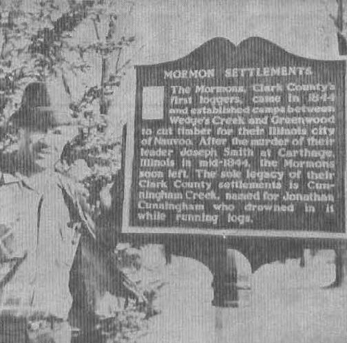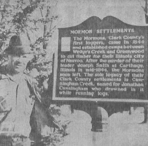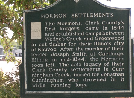 Greenwood – A registered historical marker, sponsored by the Clark County Historical Society, has been erected in the Greenwood city  park in memory of the Mormons who are said to have been the first white settlers to locate in Clark County in 1844.