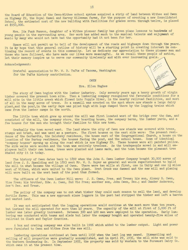 The history of Owen dates back to 1892 when the John S. Owen Lumber Company