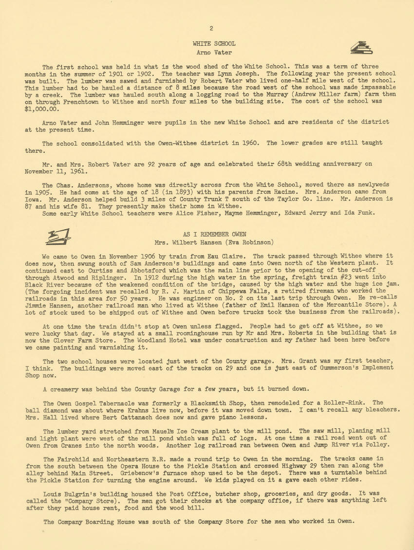 We came to Owen in November 1906 by train from Eau Claire. The track passed