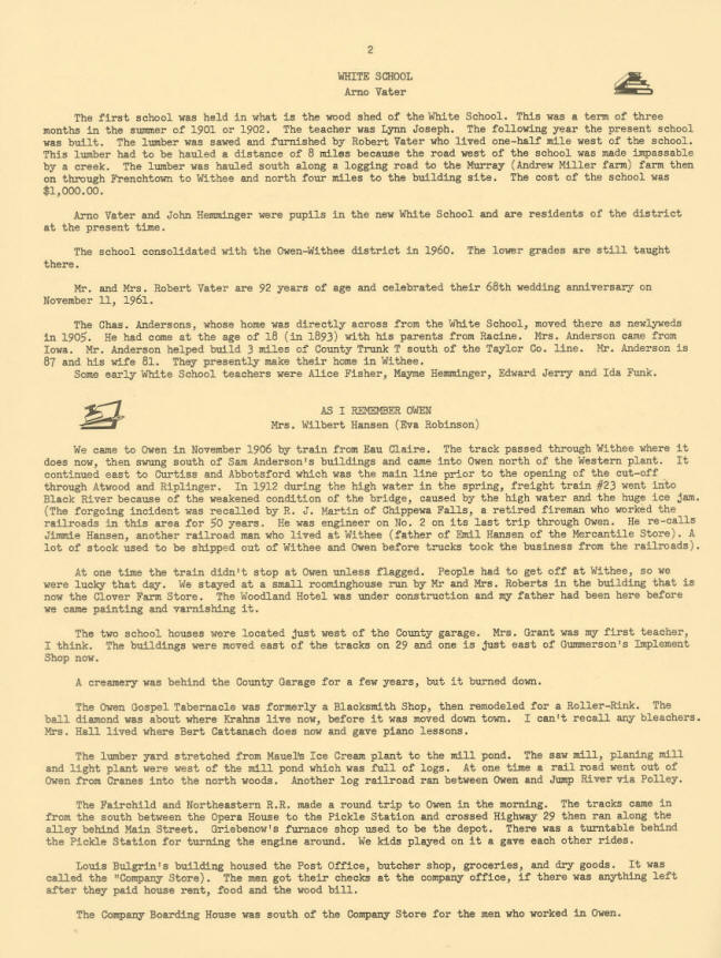logs. At one time a rail road went out of Owen from Cranes into the north woods.