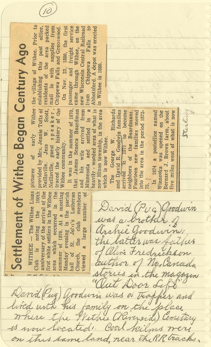 David (PVC) Goodwin was a brother of Archie Goodwin. The latter was father of Olive Fredrickson , author of North Canada stories in the magazine Outdoor Life.. David (Pug) woodwind was a trapper and lived with his family on the place where the Withee Riverside Cemetery is now located. Coal kilns were on the same land near the railroad tracks. |