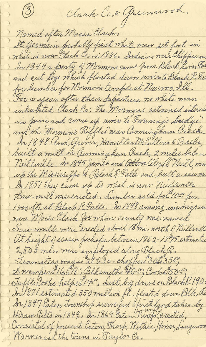 St. Germain probably first white man set foot in what is now Clark County and 1836. Indians were Chippewas. In 1844, a party of Mormons came up from Black Rubber Falls and cut logs which floated down river to Black River Falls for lumber for Mormon's temple at Nauvoo, Illinois. For a year after their departure, no white man inhabited Clark County. The Mormons retained interest in pine and came up river to "Farming's bridge" and the "Mormon's Riffles" near Cunningham Creek.