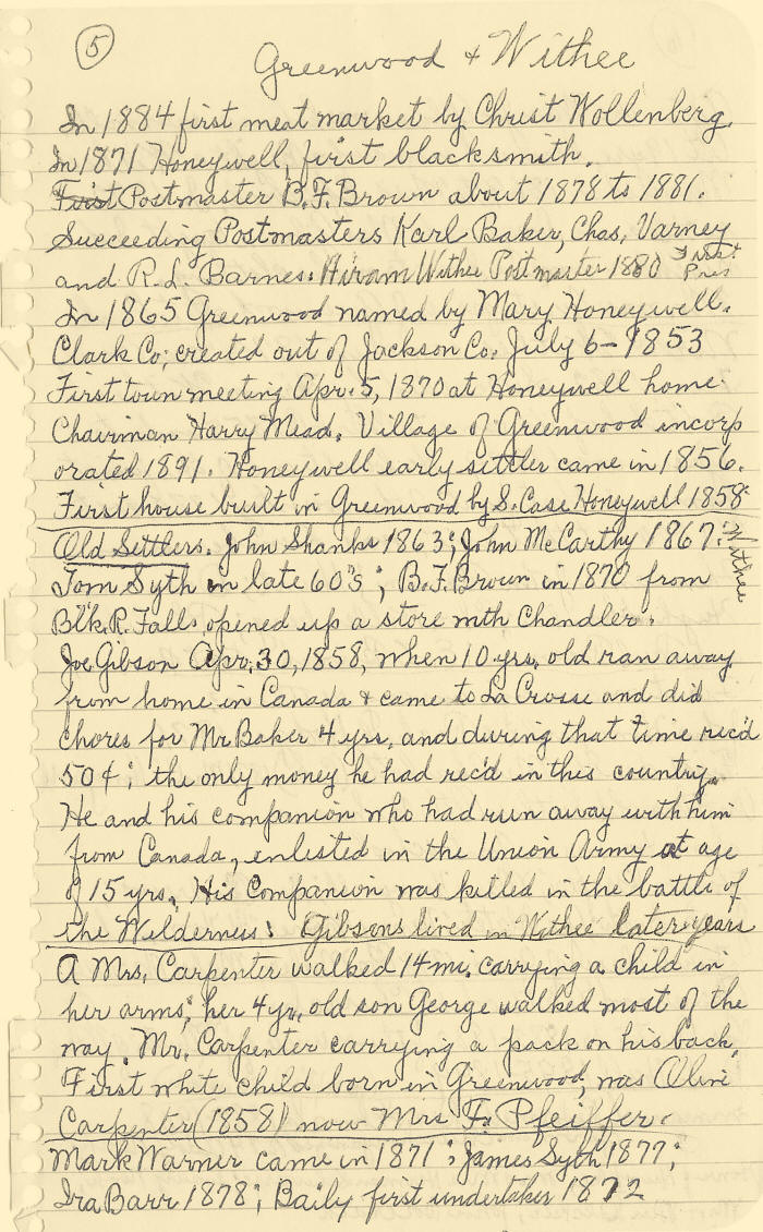 Old Settlers of Withee: John Shanks, 1863; John McCarthy, 1867; Tom Syth in late 1860s; B.F. Brown in 1870 from Black River Falls. Opened up a store with Chandler. Joel Gibson, April 30th, 1858, when 10 years old ran away from home in Canada and came to La Crosse and did chores for Mr. Baker for four years. During that time he received 50¢; the only money he had received in this country. He and his companion, who had run away with him from Canada, enlisted in the Union Army at the age of 15 years. His companion was killed in the battle of the Wilderness. Gibsons lived in Withee in later years.