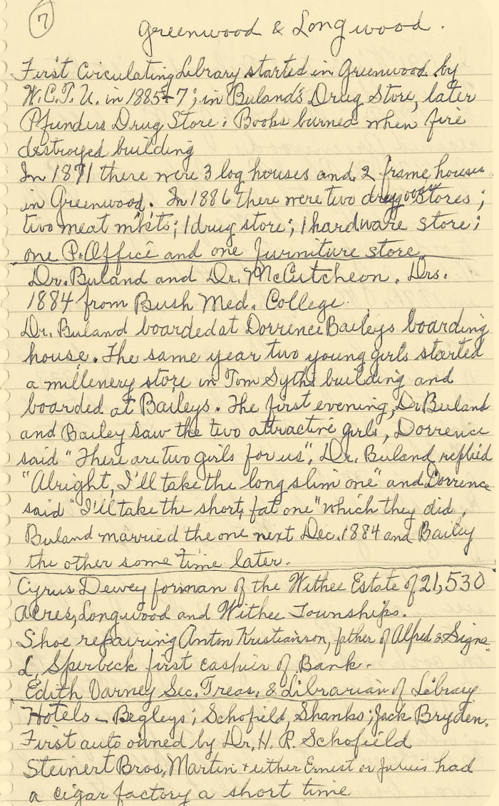 First circulating libraries started in Greenwood by WCTU in 1885-1887, in Buland's Drug Store (later Pfunders Drug Store) blocks burned when fire destroyed building.