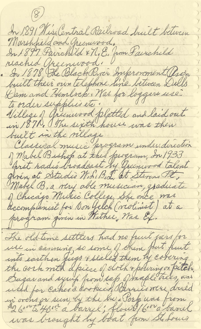 Village of Greenwood platted and laid out in 1871. The sixth house was then built in the village. Classical music program under direction of Mabel Bishop at this program. In 1933, first radio broadcast by Greenwood talent given at studio WLBL at Stevens Point. Mabel B., a very able musician, graduate of Chicago Music College. She once was accompianist for Von Gelch, violinist, at a program given in Withee.