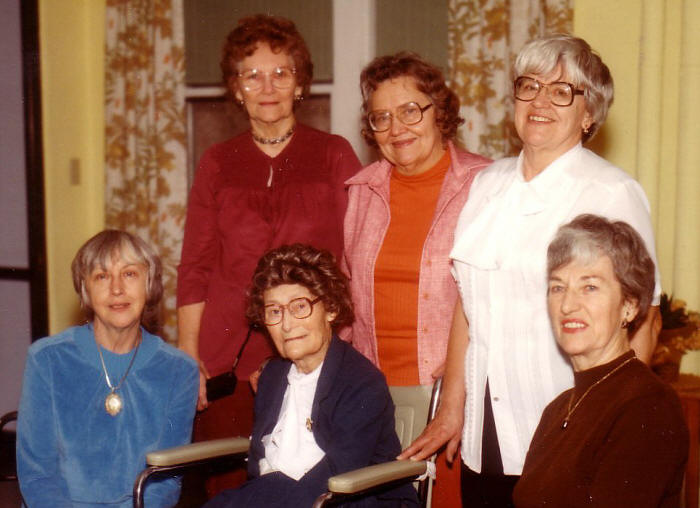 The 97th birthday of Theresa Funk.  Left to right in back: my mother, Ruth Martin (daughter of Anna and Andrew Davidson), Ethel Engel (daughter of Norma & George Funk);  Beryl Flaatten (daughter of Norma and George Funk); left to right in front: Thelma Omari (daughter of Norma and George Funk); Theresa Funk (daughter of Charles and Minnie Funk); My aunt Phyllis Davidson (daughter of Anna and Andrew Davidson).