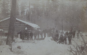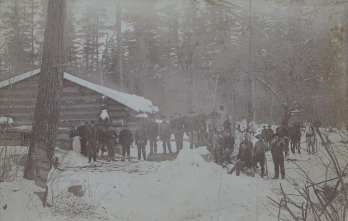 Charles Funk, wearing a large hat, with a cant hook in hand.  Otto Funk is sitting.  This photo was taken at a lumber camp.