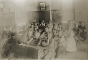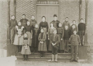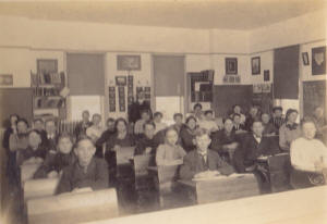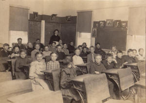 Farthest Row of desks beginning at the left front: Engelbert Klensing, Walter Hansen (brother of Emil, Alfred, Lillie), George Jacobsen, Letha Huey, Norma Wittemore, Margaret Sorenson (Mrs. Konich),  Rose Laneville (Floyd McErn), Edith or Emmy Laneville, Agnes Jensen (Mill-road, Jensen), Viola Weddig, Laura Fitzgerald, Amelia Sorenson.  Middle Row, beginning front: Richard Sorenson (brother of Gladys Margaret), Einer Jensen, Clarence Hansen (brother of Lillian), Alfred Hansen (brother of Emil A. Hansen Tillie), Bernard Tufts, Edmund Funk, Irma Schill, Anna Hansen, Sophie Petersen, John Mentges, Emil Hansen (brother of Alfred & Tillie), Volberg Jensen (sister of Lena, Shanna), Sylvia Valliquette (sister of Lester), Miss Kathryn Phillippe--Teacher.