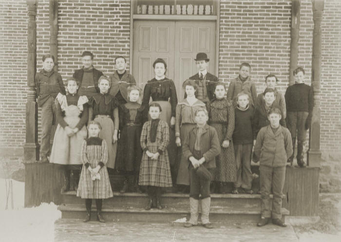 Teacher--Anna McLeod; Beginning at left, back seat: Arthur Ammentorp (Minister), Margaret Conley, Ellen Nosgaard, Emma Funk, LeNoir LaFlex, Nora or Anna Smith.  2nd Row:  Leslie Kreuger, Sena or Clara Petersen, Katherine Stockholm (Viggo Hansen), Anna Mary Krarup, Holgar Rasmussen (Wis. Senator), Gladys Huey (teacher, Mrs. Lee), Edmund Hansen (brother of John, Christina, Helen, Lizzie), Holgar Hansen (Restaurant Hansen).  3rd Row: Carl Fiske (Bessie's brother), Margaret Fitzgerald, Olga or Alma Hansen, Ray McCormick, Harry Raymond (Bernice McAdams), Clara or Olga Hansen, Tommie & Arne? Thompson.  4th Row: Lillian Hansen (Geo. Carlsen),  Thora Hansen (mother of Evelyn), Frances Brown (teacher, Mrs. Pascoe), Hans Clausen (Mrs. Christenson, former, Halmar?), Rigmore Vosgaard (wife of Gor. F. Peterson, Minn?), Dagmar Hansen (sister of Harold, Wm., Caroline, Cecilia), Karen Jacobsen (Phyllis' teacher, sister of Andrew & George)  *Cora Bakke may also be on this picture.