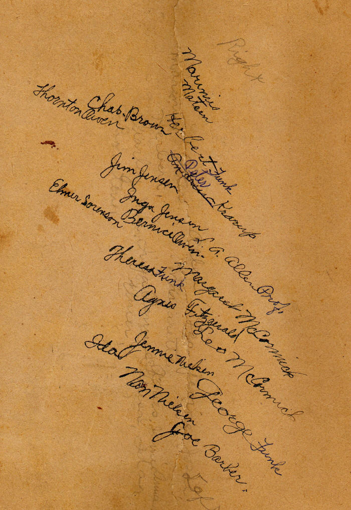 The names were all written on the back of this photo but are very difficult to read.  It appears that Marinies (sp?) Matsen, Herbert Funk, Peter Krarup, L. A. Allen (Prof.), Margaret McCormick, Leo McCormick, George Funk, Charles Brown, Jim Jensen, Inga Jenson, Bernice Owen, Theresa Fun, Agnes Fitzgerald, Jennie Nielsen, Nan Nielsen, Thornton Owen, Elmer Sorenson and Ida ? were all in the picture.