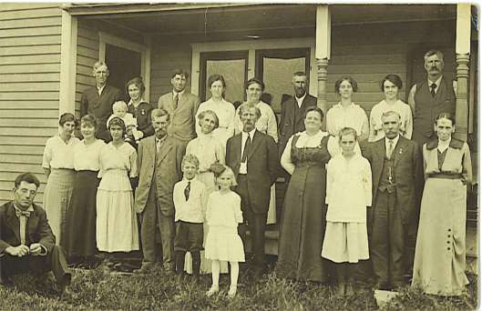 Back row l to r: Earl A Brooks, Ida (Inga) Thorsen Brooks holding son George T., Ernest Montag and Elsie Brooks Montag, Emma Brooks, Dan Brooks, Vivian, Esther Brooks, George R. Brooks.