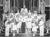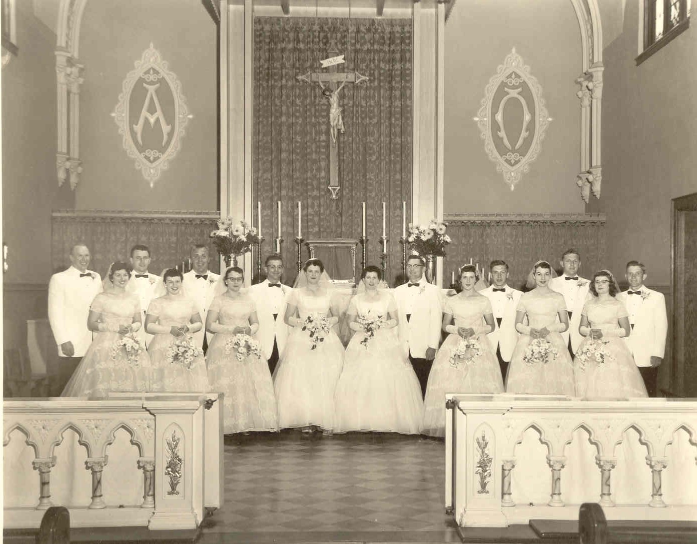 The sanctuary of the church in its pre-Second Vatican Council, pre-1972 renovation appearance. The occasion was the June 13, 1957 double wedding of sisters Elaine (center left) and Mildred Kessler (center right) to James Haas and Ernest Schwellenbach. Especially note the marble communion rail. |
