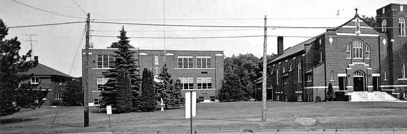 The church grounds with the three of the four current buildings. From the left, the convent (now the office) completed in 1955; the school completed in 1939; and the Church completed in 1924. This photo was taken before the 1979 carport addition to the church. |