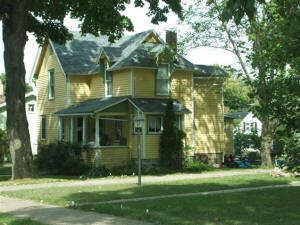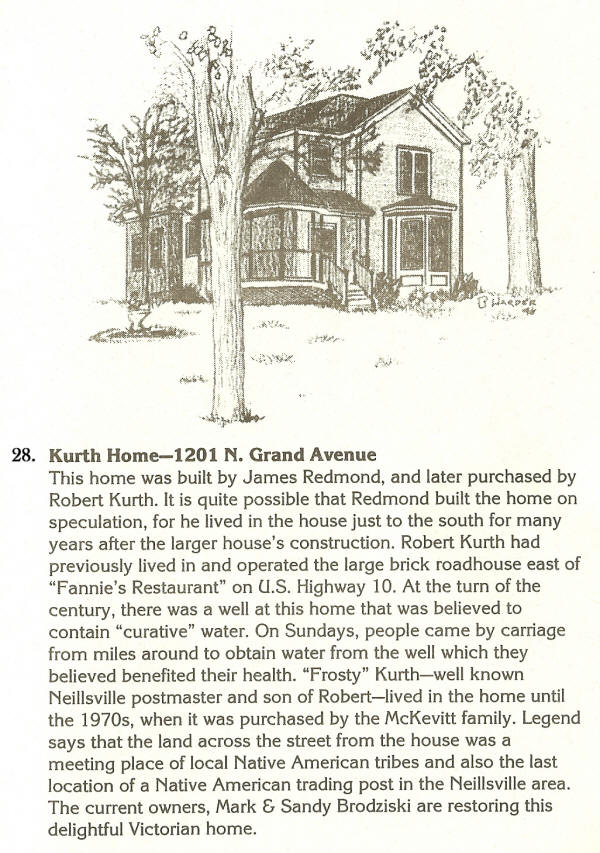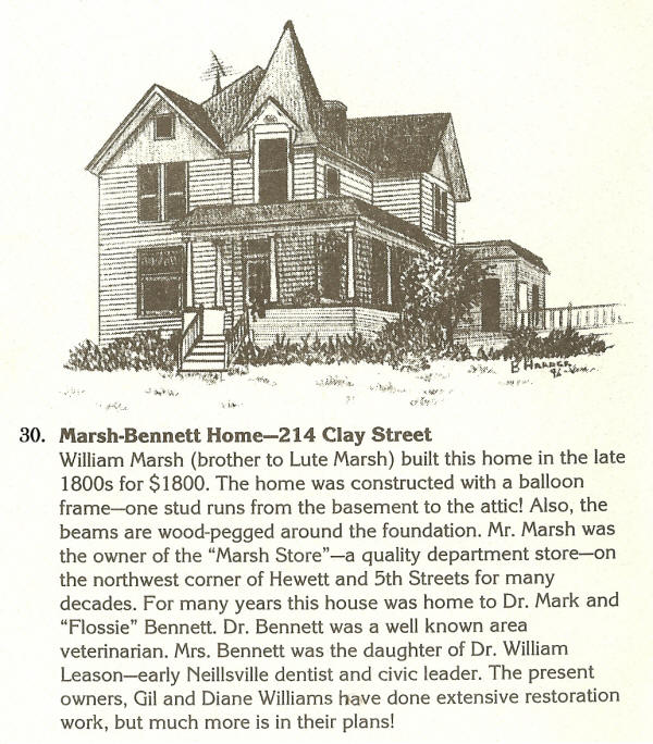 Marsh-Bennett Home, 214 Clay Street William Marsh (brother to Lute Marsh) built this home in the late 1800s for $1800. The home was constructed with a balloon frame--one stud runs from the basement to the attic! Also, the beams are wood-pegged around the foundation. Mr. Marsh was the owner of the "Marsh Store"--a quality department store--on the northwest corner of Hewett and 5th Streets for many decades. For many years this house was home to Dr. Mark and "Flossie" Bennett. Dr. Bennett was a well known area veterinarian. Mrs. Bennett was the daughter of Dr. William Leason--early Neillsville dentist and civic leader. The present owners (1998), Gill and Diane Williams have done extensive restoration work, but much more is in their plans! |