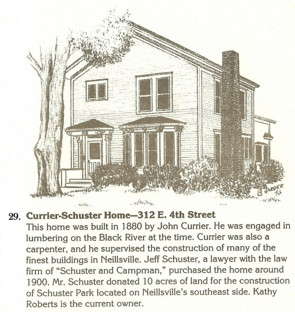 Currier-Schuster Home, 312 E. 4th Street This home was built in 1880 by John Currier. He was engaged in lumbering on the Black River at the time. Currier was also a carpenter, and he supervised the construction of many of the finest buildings in Neillsville. Jeff Schuster, a lawyer with the law firm of "Schuster and Campman," purchased the home around 1900. Mr. Schuster donated 10 Acres of land for the construction of Schuster Park located on Neillsville's southeast side. Kathy Roberts is the current owner. |