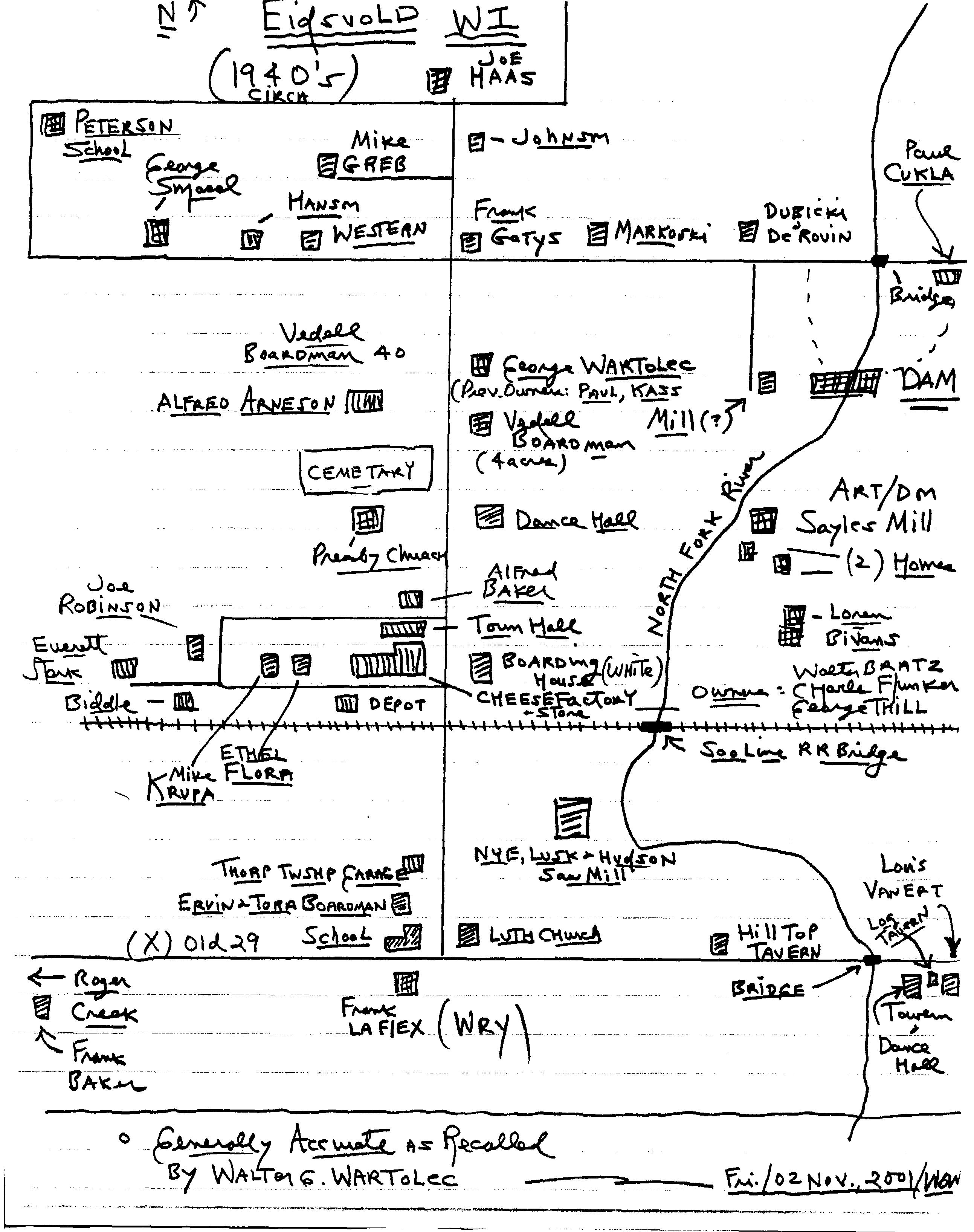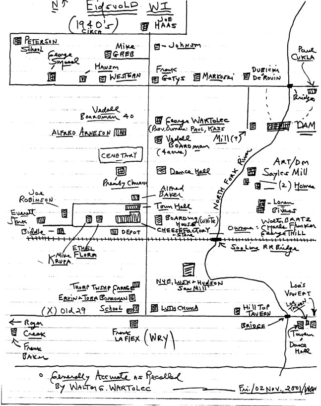 This is a sketch of the Village of Eidsvold in the 1940’s as recollected by Walter Wartolec. The sketch represents the western portion of Section 27 and the eastern portion of Section 28 of the Township of Thorp. Portions of Sections 21 & 22 are on the north, and Sections 33 & 34 to the south of old Highway 29.