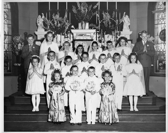 St. Anne's Catholic Church, Stanley, WISt. Anne's Catholic Church is located in Stanley, just to the west of the Town of Thorp in Chippewa County. It draws it's membership from the local area, including Clark County. St. Anne's Church First Communicants, c. (spring?) 1949:First Communicants in Stanley -- A large class of first communicants from St. Ann�s Parish, Stanley, are happy as they pose before the church�s main altar. Left to right, they are, first row: Judith Kolstad, Daniel Logan, Alan Lund, and Marlene Wolfe; second row: Janet Diedrich, Kenneth Seufzer, Henry Caza, Bernard Goettl, Ronald Hakes, Bernard Stuttgen, and Bonnita Kolstad; third row: Lawrence Duss, Hermelda Goettl, Rachel Micke, Judith Wolfe, Joan Anthony, Frances Schesel, LaVerne Goettl and Paul Forster. --Stanley Republican, date unknown. |