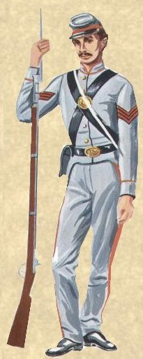 The 2nd New Hampshire wore the Union gray uniforms with "spiketail" dress coats trimmed in red cord, and "jaunty forage caps" with "2nd NH" on the crown.