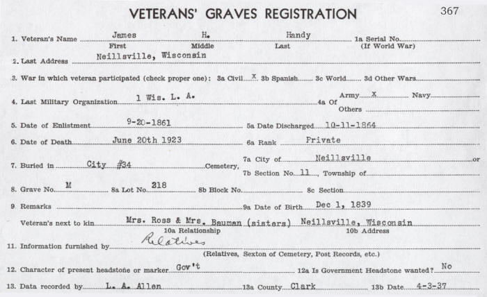 | Harding | William | GRANT TOWNSHIP | GRANT | 1821-1903; Co. L, 1st WI H. A.; PVT; 29Aug1863-26Jun1865; VGR#138; Obit | 25Jan1821-4Apr1903 | Abe Harding-son of Granton |