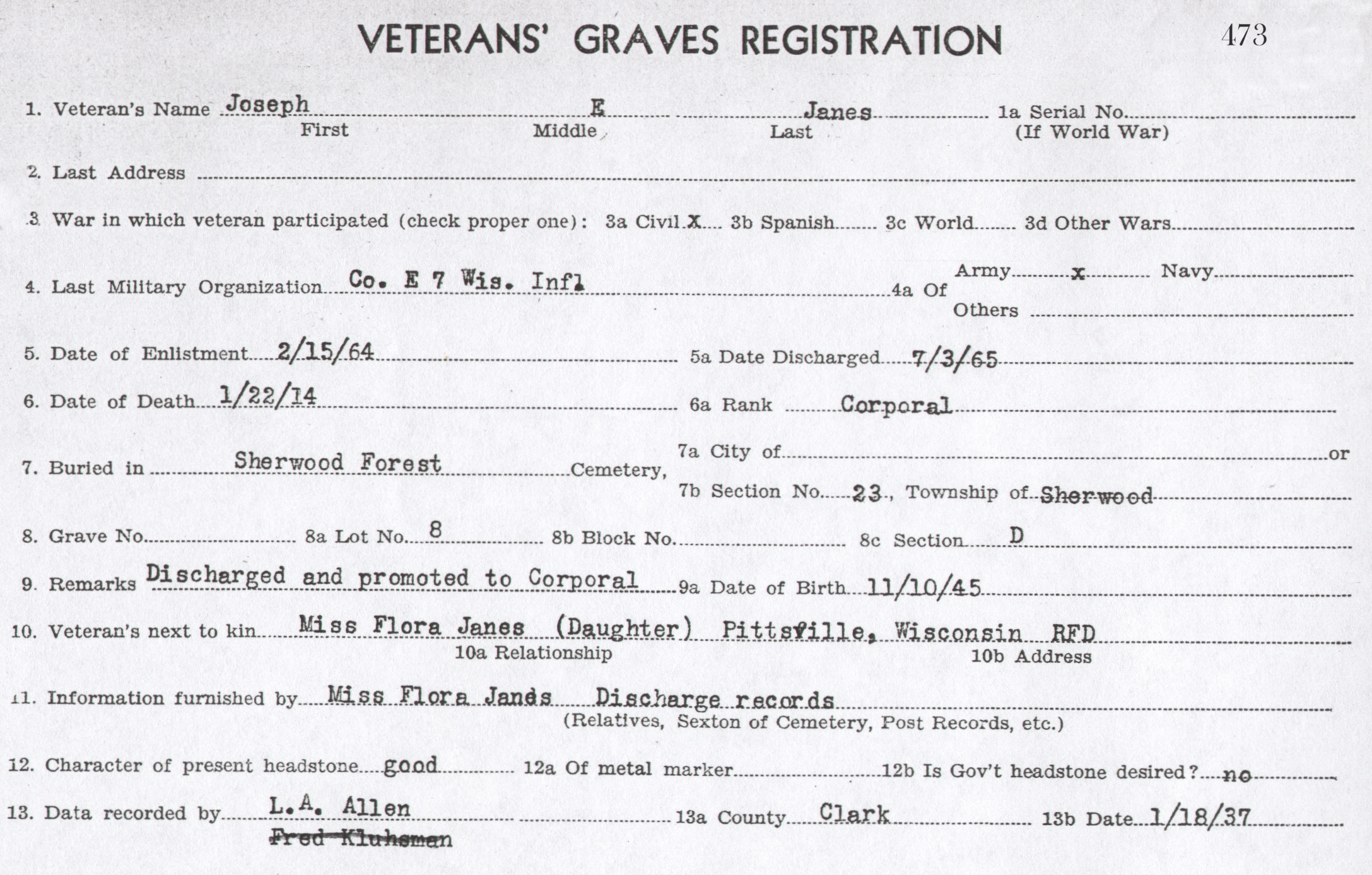 | Genett | Jefferson | WEST SPENCER | SHERMAN | Co D, 42nd WI Inf | ||