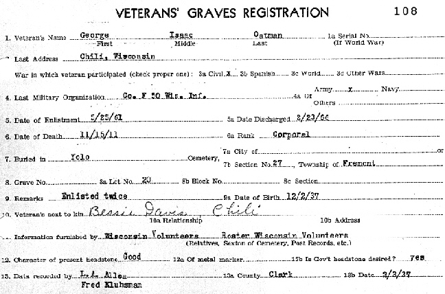 PINE VALLEY | 1827-1922; Co. G, 14th WI Inf.; CPL; 12Sep1863-9Oct1865; VGR#398; Obit | 9Aug1827-16Oct1922 | Mrs. Joe Bass-dau. of Neillsville & J. L. Neverman Records |
