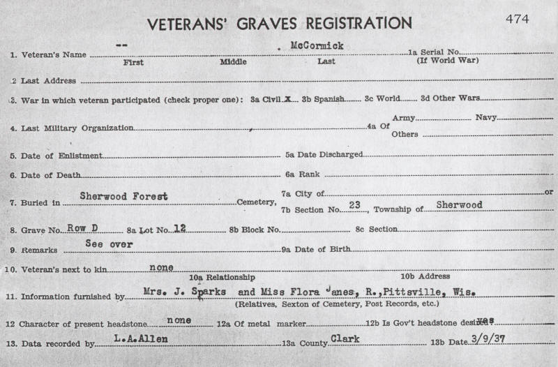 SHERWOOD | B. 1839, D. March 17, 1884; Union Army; Bio; Obit; VGR#474 | For years, this McCormick and Hugh Perkins lived and were well known in this neighborhood. Also well knnown that they were old veterans. | |