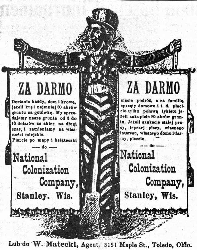 This image was taken from an 1897 Polish newspaper published in Chicago offering a free house and a cow to anyone who purchases at least 80 acres of land near Stanley, which at the time sold for $8 an acre. If you know more about this particular ad, let us know what you may recall.