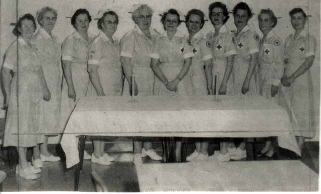 A collection of nurses’ stand behind a folding table spread with tablecloth and two lit candles. Know anything about the group? Where was it taken? Why are there candles on the table? Let us know if you know anything about this assemblage of nurses.
