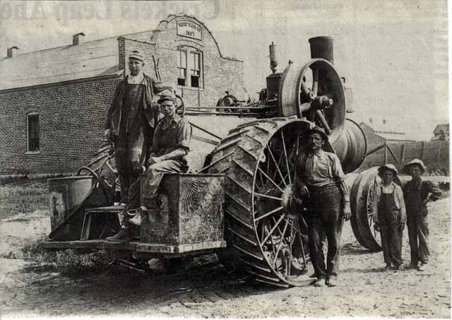 This week, we have some men and boys, obviously dressed for work, next to a rather impressive machine.  The mud and dirt indicate this is probably an agricultural machine of some sort.  Do you know what this is or who these people are?  Do you know when and where this photo was taken?