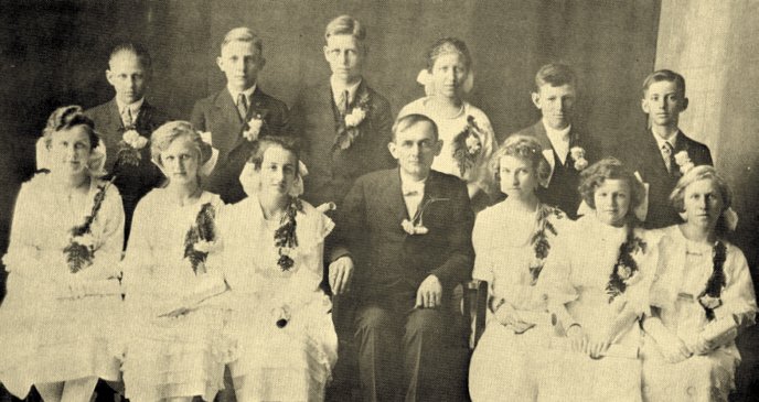 Seated: Hilda Heideman, Isabel Martin, Pastor Laabs, Myrtle