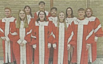 Choir students (above, front, l-r) Kenadi Urban (alto), Karli Gross (soprano), Gracie Schoengarth (alto), Jackson Hemp (tenor), (back) Wesley Swita (bass), Jada Gurney (alto), Andrew Hoeser (bass), Zion Jones (bass), Mireya Ziebell (soprano), Olivia Koprek (soprano) worked with Dr. Christopher McGinley, associate professor director of choral activities at the UW-Eau Claire.
