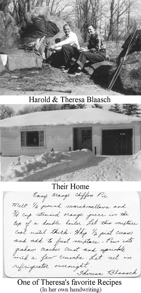 Harold and Theresa Blaach resided in Greenwood, Wisconsin and were members of the United Methodist Church. Below they are pictured fishing off the bank of the Black River. This picture and that of their home and a favorite recipe of Theresa's were contributed to the "Women's Club" of Greenwood for historical preservation.