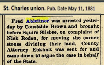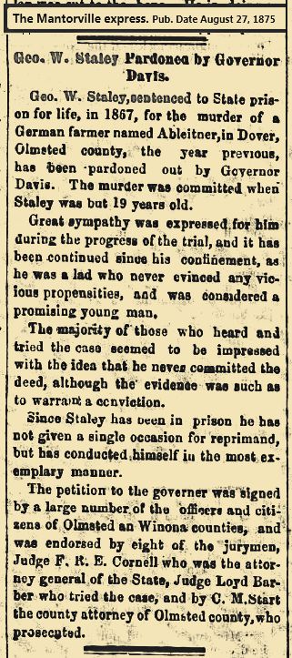 Civil War Veteran, George Winters Staley, was awakened at 3 a.m. at Allen's Lumber camp on Wedge's Creek in Clark Co., Wis. and arrested for the murder of "Fred" Ableitner, a four year resident of Dover, Minn.