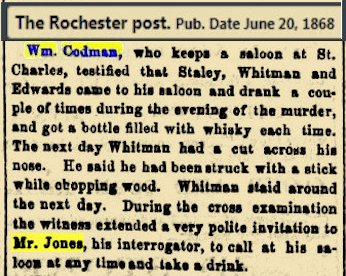 Wm. Codman--(52 yrs. old) Reside at St. Charles; know defendant. Staley and Whitman and Edwards; only seen Staley and Edwards a few times; keep calling house; evening before the murder defendants were at my saloon twice; .first time between 5 and 6 p.m.. Whitman came around again the next morning; saw a mark across the bridge of his nose; looked as if struck with a club; I said, "what ails your face?" Said he was chopping wood and a stick flew up and hit him.