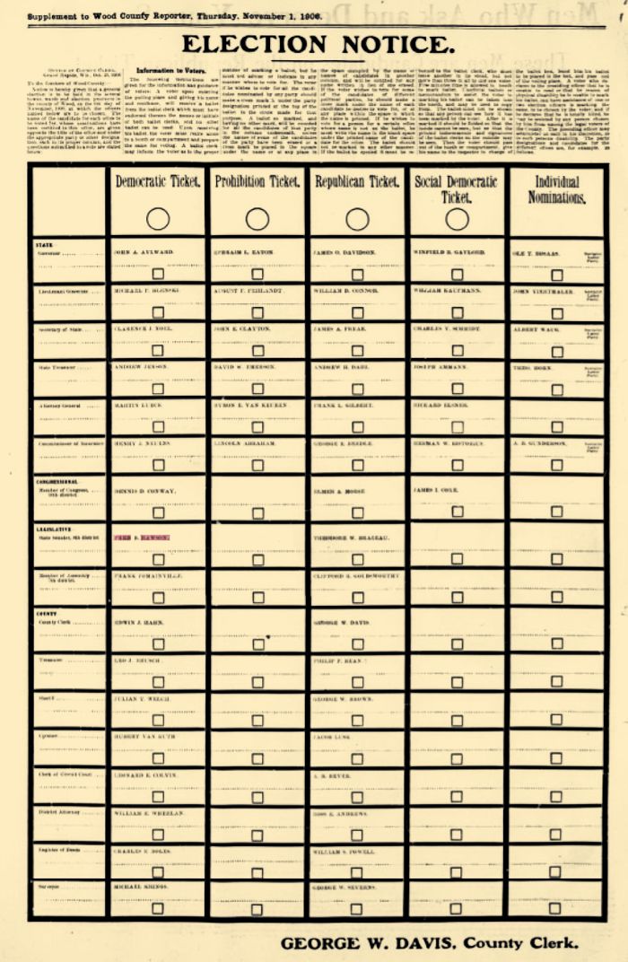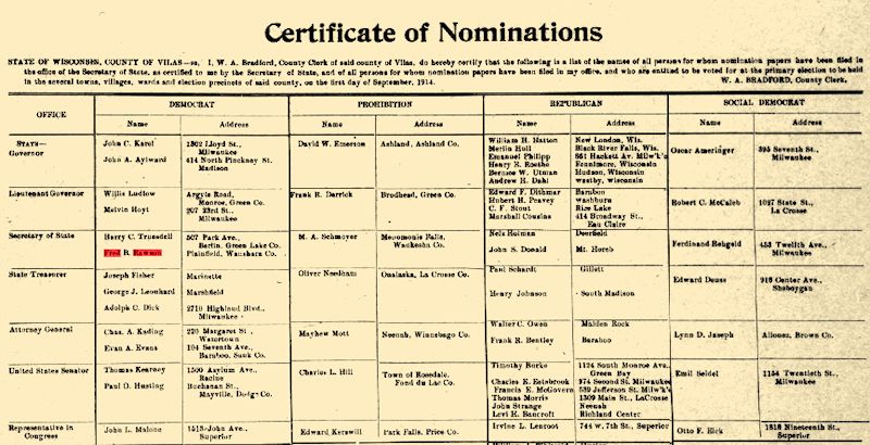 In Wood Co., WI Fred Beecher Rawson was on the ticket as a Legislator for the 9th district in 1906. In 1914, Fred B.Rawson ran in Wis. for Sec. of State as a Democrat. His address was listed as Plainfield, Waushara Co. 507 Park Ave., Berlin, Green Lake Co.