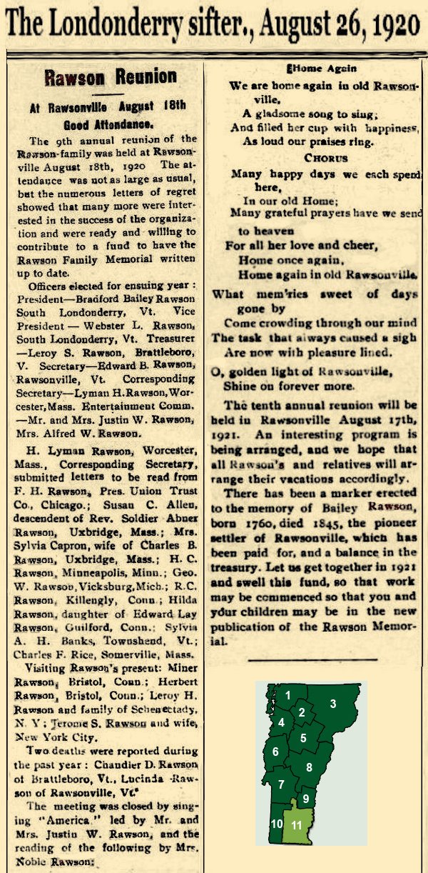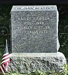 Rawsonville is in Jamaica, Windham Co., VT, located at the junction of Route 100 and Route 30. Near the junction is a tiny fenced area, a monument for the founder of Rawsonville, Bailey Rawson. A few hundred yards from the monument is his actual grave, where it says that he was a pensioner of the Revolutionary War.