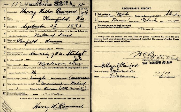 Harry Walker Rawson, 24 yrs. old, born: 25 Sep 1893 in Plainfield, Waushara,