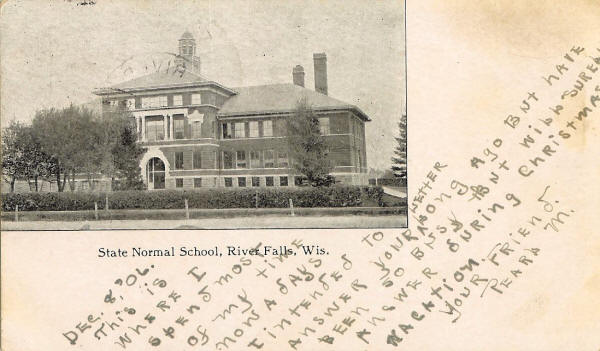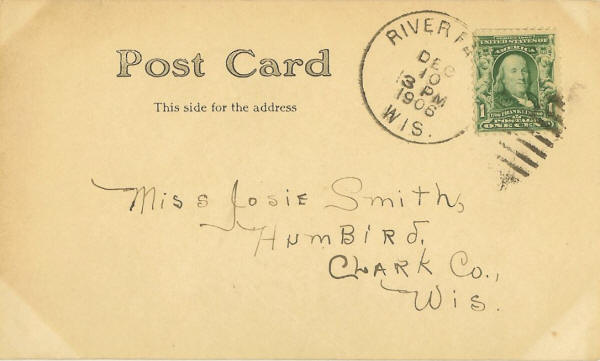 To Miss Josie Smith (Scmidt) Humbird Clark Co., Wisconsin (3 pm, 10 Dec 1906) Dec. 8, '06. This is where I spent most of my time. Now A says I intended to answer your letter long ago But been so busy it isn't written? Sure will answer during Christmas vacation. Your Friend, Peara M.