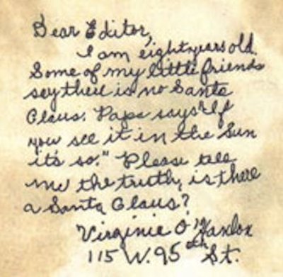 Eight-year-old Virginia O’Hanlon wrote a letter to the editor of New York’s Sun, and the quick response was printed as an unsigned editorial Sept. 21, 1897. The work of veteran newsman Francis Pharcellus Church has since become history’s most reprinted newspaper editorial, appearing in part or whole in dozens of languages in books, movies, and other editorials, and on posters and stamps |