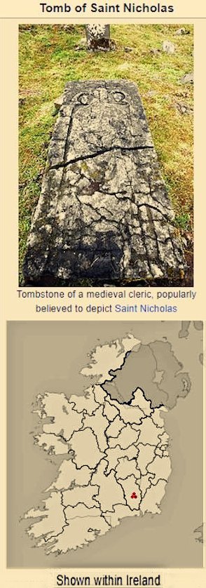 Jerpoint, just west of the Cistercian Jerpoint Abbey. It is 2.0 miles (3.2 km) southwest of Thomastown in the grounds of the privately owned Jerpoint Park. St. Nicholas's Church and graveyard are in the town, where the earthly remains of St. Nicholas of Myra are said to be buried. Belmore House stands at the top of the town. The memorial has been moved since 1839, and has sustained damage from the fall of a tree A conservation plan was developed by the Heritage Council in 2007. In advance of conservation work in 2013, St. Nicholas' church and the tomb were surveyed and modeled in 3D. The bones of St. Nicholas, who inspired the legend of Santa Claus, were believed to have been buried in Newtown Jerpoint in the 12th century. The grave's stone slab is carved with the image of a cleric with the heads of two knights behind each shoulder, said to be those of the two crusaders who, so the story goes, brought Nicholas's remains to Ireland. Evidence lends some credence to this tale as the Normans in Kilkenny were keen collectors of religious relics, and it is known that Norman knights participated in the Holy Land Crusades. |