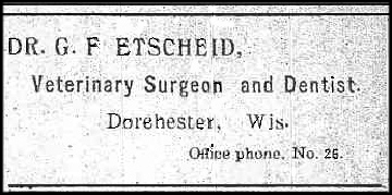 The advertisement below was scanned from the "Clark County Herald", 17 Apr 1908, for Dr. G. F. Etscheid, Veterinarian and Dentist, Dorchester, WI.